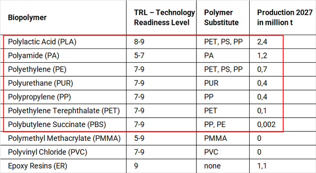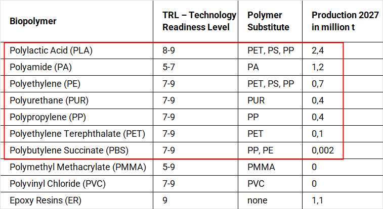 In addition, only biopolymers with a forecasted annual production of more than 1 kilotonne (kt) in 2027 were considered.