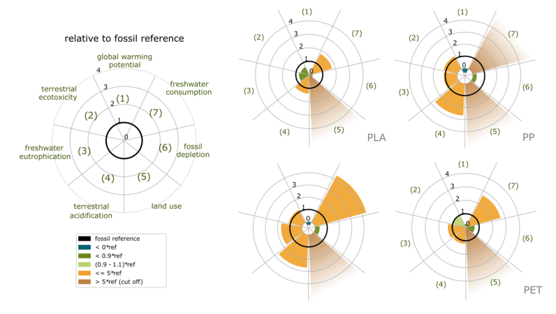 Due to the very different application-specific uses of the biopolymers, direct comparisons are generally difficult. Therefore, only four biopolymers—PLA, HDPE, PP, and PET—commonly used in the food packaging industry, for example as bottle or cup materials, were considered here. Each was compared to its fossil-based reference polymer. These biopolymers are sugar-based, produced from various feedstocks (in this case: sugar beet, maize, and residual wood).