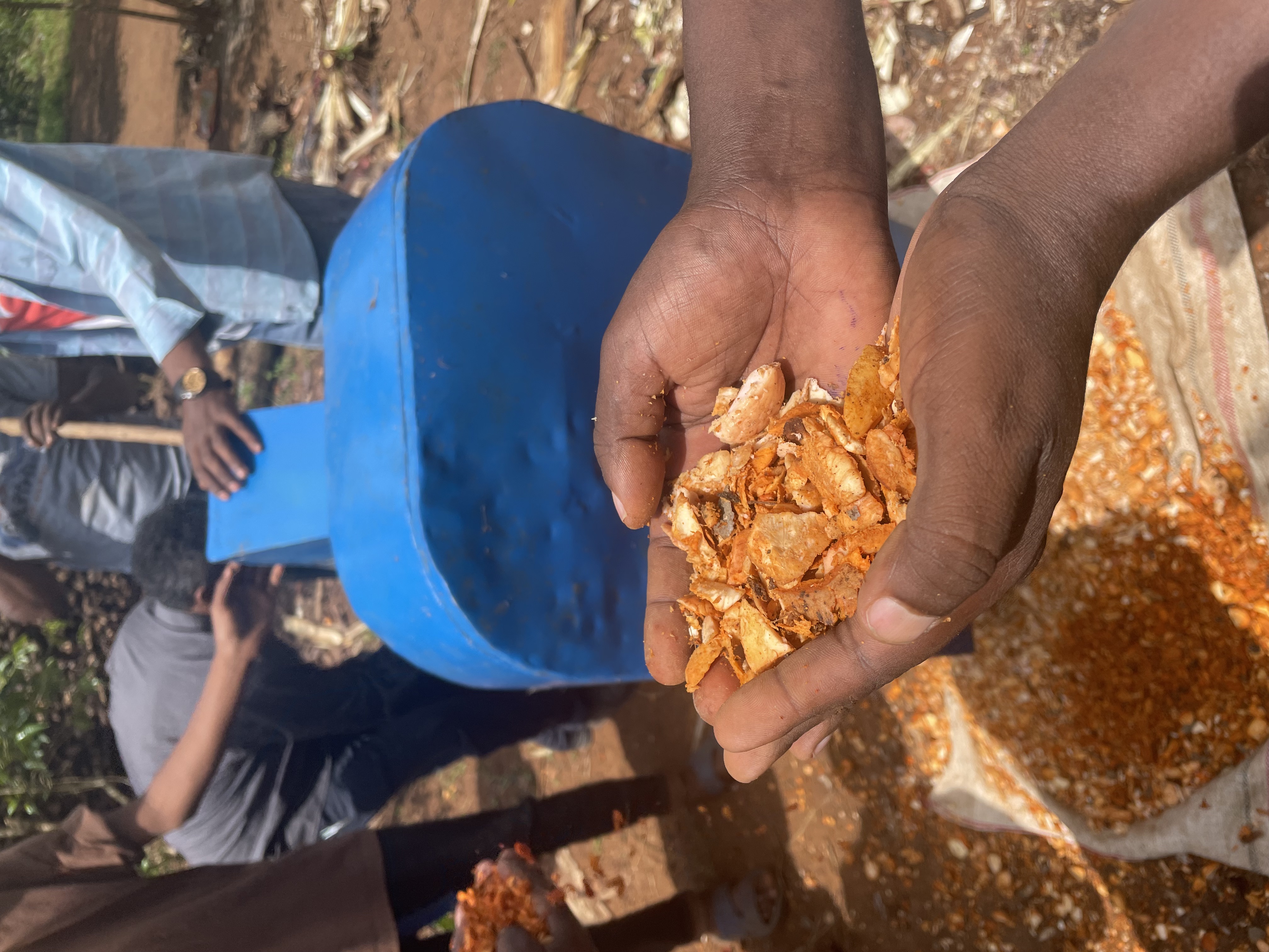 In Sidama, large amounts of avocado waste materials are generated – both pruning residues from orchards and kernels from oil production – that remain largely unused. ETH-Soil is addressing this challenge by transforming these materials into a valuable resource. For the utilisation for biochar, the feedstock needs to have a very low moisture level for the process to run smoothly and without excessive emissions. Avocado kernels, however, dry slowly and start to rot when left in batches. To solve this issue, the Avocado kernels are being milled and subsequently dried. The initially manual process proved to be timely which is why project partner ANDRB trialed successfully the use of machines.The next step is to make this technology accessible to local farmers.