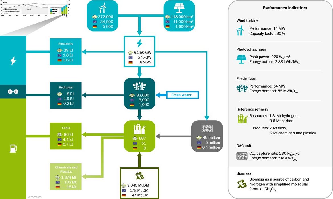 In the baseline scenario presented, this corresponds to the mobilisation of over 3.5 billion t/a of biomass (DM) and the installation of 45 million DAC collectors to provide carbon dioxide, 83,000 water electrolysers for hydrogen, 372,000 wind turbines and 118,000 km² of PV area to provide electricity for direct use in electric vehicles and for the electricity-based energy carriers hydrogen and e-fuels by 2050.