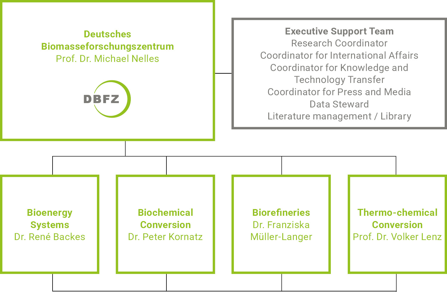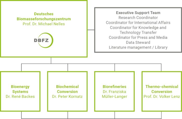 As an organisational framework for the processing of the numerous scientific research tasks, there are four research departments at the DBFZ which cooperate closely in practice. While the departments of biochemical conversion, thermo-chemical conversion and biorefineries mainly carry out applied research tasks, the Bioenergy Systems Department develops not only policy advice but also potential analyses, acceptance studies and various scenarios for biomass use.