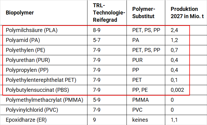 Zudem wurden nur Biopolymere betrachtet, für die in 2027 eine größere jährliche Produktion als 1 kt prognostiziert wurde.