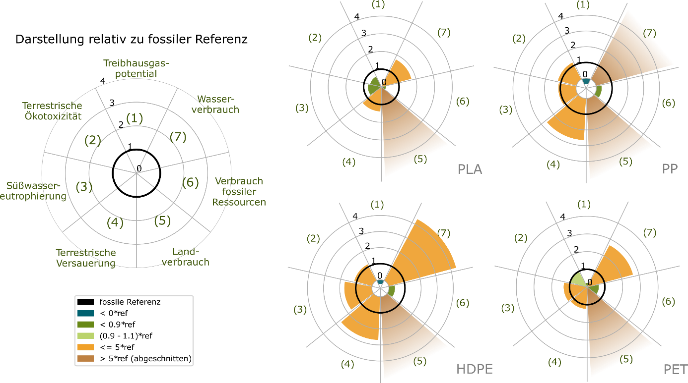 Grundsätzlich ist ein Vergleich der Biopolymere aufgrund ihrer sehr unterschiedlichen anwendungsspezifischen Einsatzmöglichkeiten schwierig. Im Folgenden werden deshalb nur die vier Biopolymere PLA, HDPE, PP und PET, die in der Lebensmittelverpackungsindustrie beispielsweise als Flaschen- oder Bechermaterial eingesetzt werden, betrachtet. Sie werden jeweils mit ihrer fossilen Referenz verglichen. Diese betrachteten Biopolymere werden auf Zuckerbasis aus verschiedenen Ausgangsstoffen (hier: Zuckerrüben, Mais und Holzreststoffen) hergestellt.
