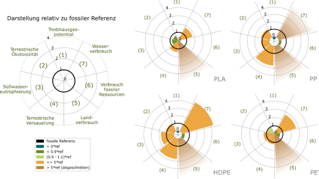 Neben diesen deutlichen Einsparungen wird auch bei allen anderen Biopolymeren der Verbrauch fossiler Ressourcen gegenüber den jeweiligen fossilen Referenzen reduziert. In den anderen Umweltwirkungskategorien schneiden die Biopolymere je nach eingesetztem Ausgangsstoff unterschiedlich ab.